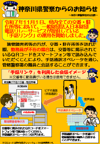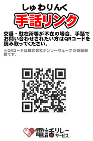 「手話リンク」は、一般財団法人日本財団電話リレーサービスが提供している聴覚障害者等の利便性を向上させるサービスで、令和7年11月1日から聴覚障害者等の方が勤務員不在の交番、駐在所等を訪れた際、不在表示板や出入口等に掲示したQRコードをスマートフォン等で読み込むことにより、手話通訳オペレータを通じて警察署の代表電話につながり、お問合せができるようなります。