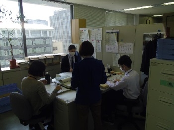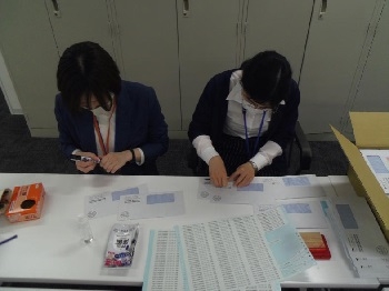 スタッフは、自席でパソコンを使用してのデータ入力や、作業机で丁合、封入、封緘等の作業を行います。
